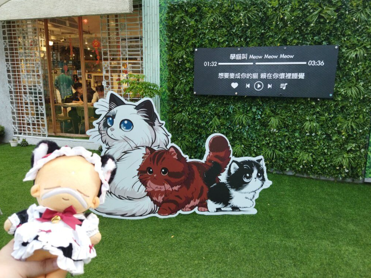 洄流Stream餐食的戶外草皮有很多景點可以拍~還有超大的貓貓立牌可以打卡拍照~拍的超級開心~意外在老婆變身成貓貓的時候,看到這個學貓叫的歌詞覺得暖暖的~變成貓貓的老婆~每天賴在懷裡睡覺~一起去吸貓~一起學貓叫~享受幸福貓生~