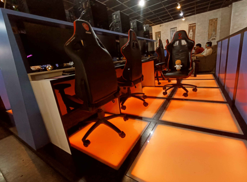 玩很大資訊電競館,最讓人印象深刻的裝潢區域,就是電競區的舞台七彩地板燈,搭配上酷炫的電競座椅氛勢感滿滿~